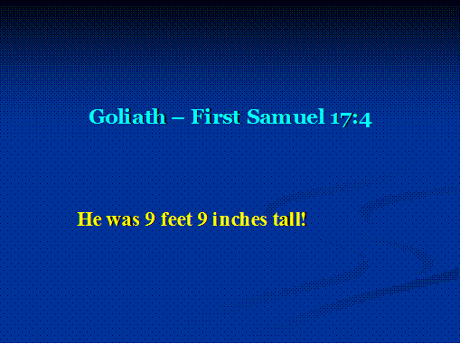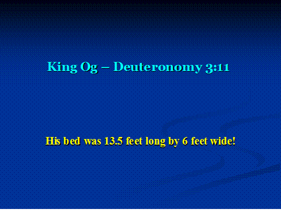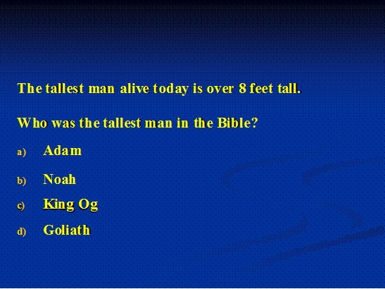 Who was the tallest man in the Bible? a) Adam, b) Noah, c) King Og or d) Goliath?] Relative to King Og PP