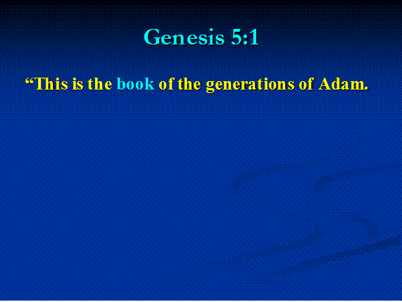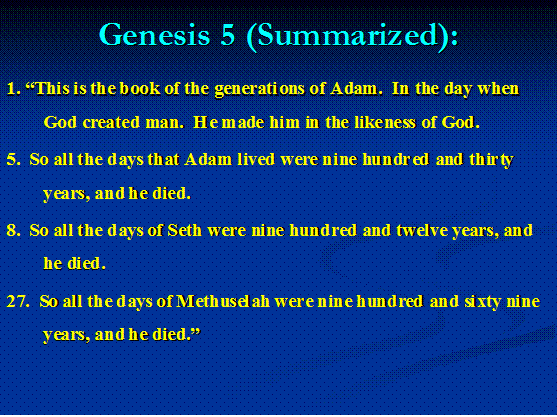 at Genesis 5, the genealogy of the first generations of man. Genesis 5 lists the ten Biblical patriarchs